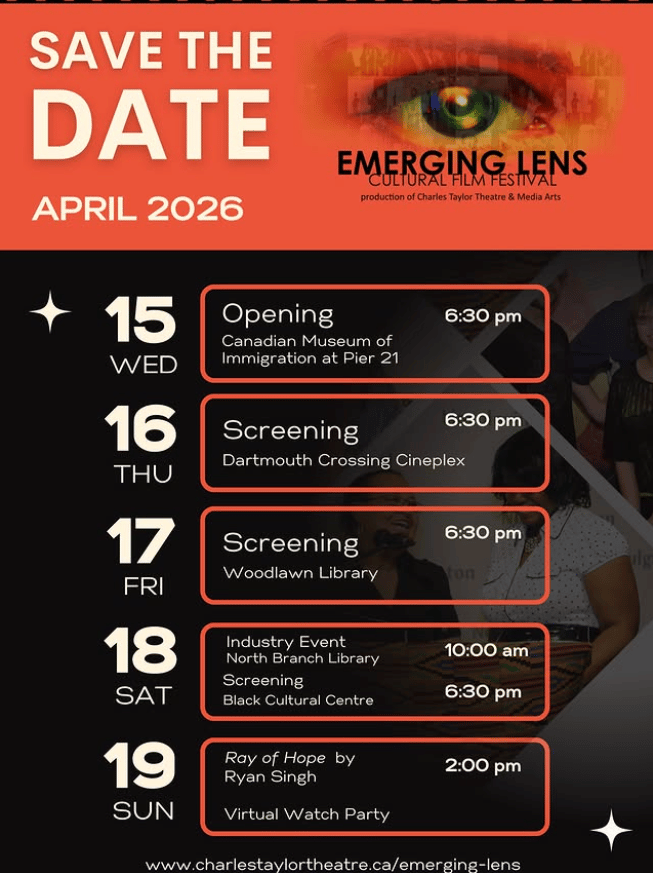 ![]() For more information about the events click here. | Emerging Lens Film Festival![]() The Emerging Lens Cultural Film Festival returns this April 15 -19, 2026, bringing together film, culture, and community across Halifax and Dartmouth. Presented by the Charles Taylor Theatre & Media Arts Association, Emerging Lens champions African Nova Scotian and culturally diverse filmmakers by giving them the platform to tell their stories in their own voice. 🗓️ April 15 – 19, 2026 📍 Halifax / Dartmouth |