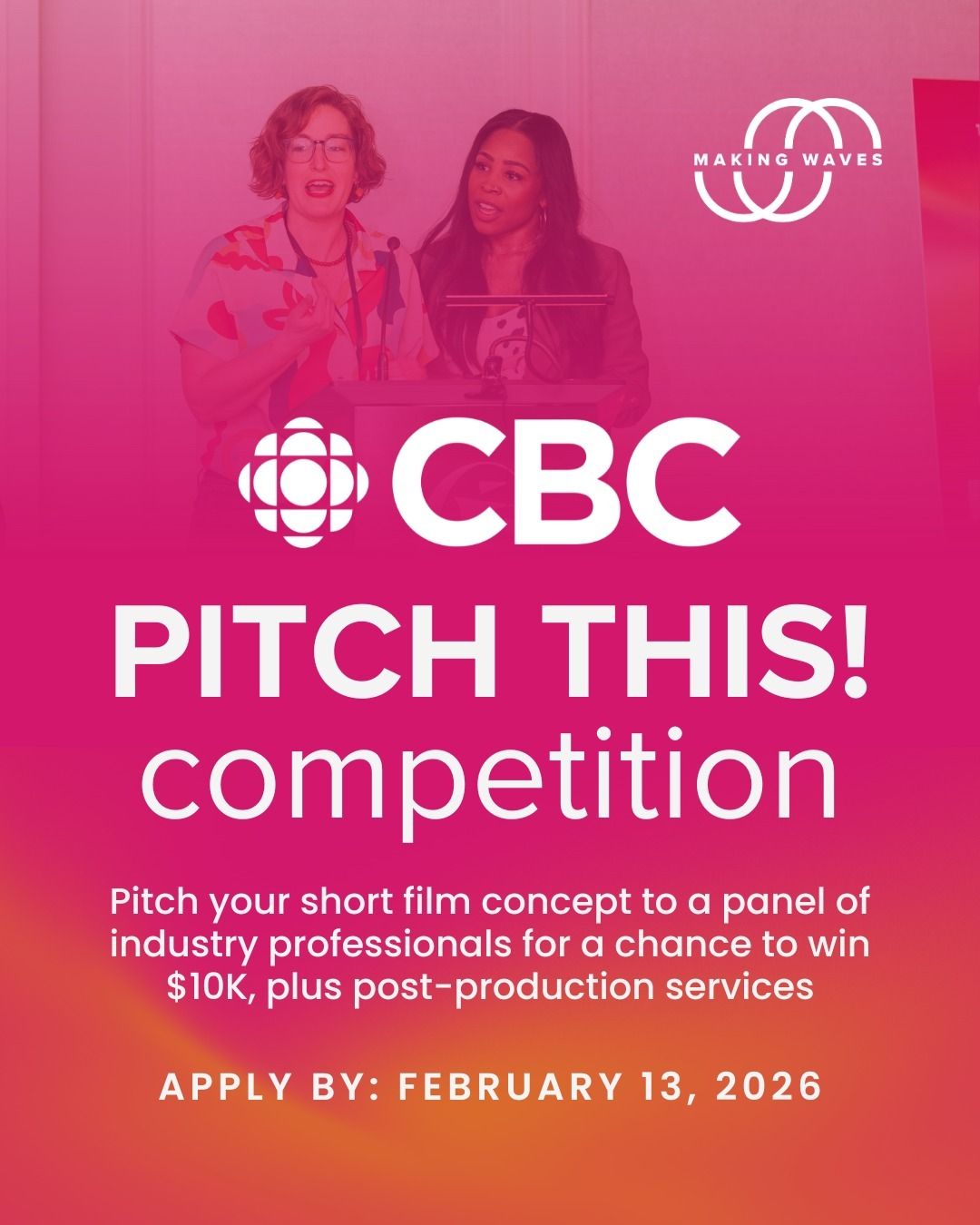 | Making Waves 2026: CBC Pitch This! The CBC Pitch This! competition returns to #MW2026 for another exciting year! Pitch your short film concept to a panel of industry professionals for a chance to win $10K plus post-production service, during the 2026 Making Waves conference (Saturday, April 11, Halifax). Five selected filmmakers will receive professional pitch training. Deadline: February 13, 2026